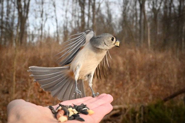 After the bluebird interlude I put the short lens back on the camera and headed back into the woods to finish my trek back to the car. As I got closer to the nature center the little birds began swarming my head. They were quite insistant. So of course I had to take the obligitory picture of a bird in the hand.