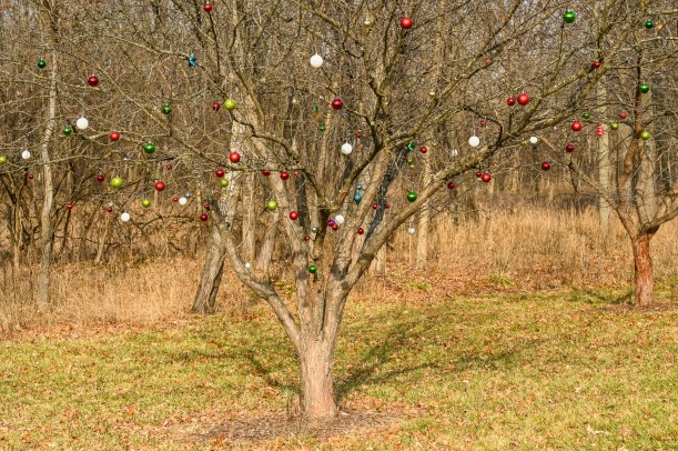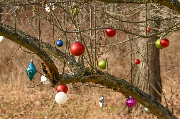 The trail took me back toward the road, and when I got out there I noticed a tree I had seen on my drive in. It was covered with ornaments and I’d thought I’d stop there on my drive out after my walk. But it wasn’t that far away, maybe about a quarter mile. And I was right there.