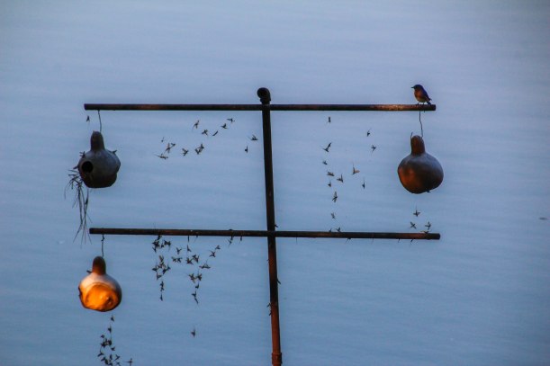 The swallow gourds out in the water had huge spiderwebs spun the night before and filled with fishflies. A male bluebird liked to sit up on top and survey his kingdom, and a female bluebird was busy taking fresh bugs into the top left gourd.