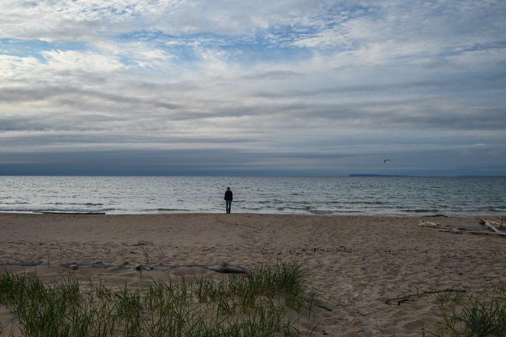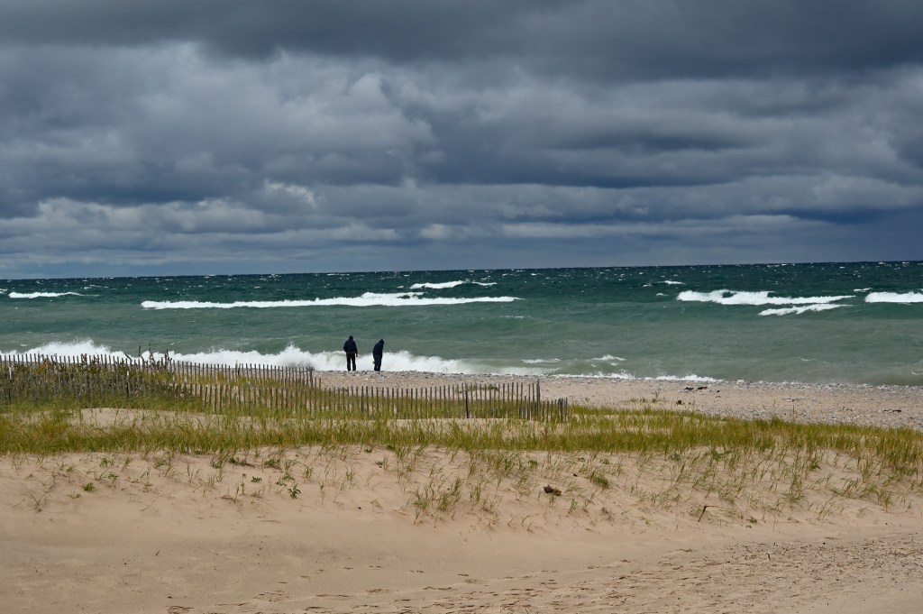 Once we were set up we walked the .8 mile through some low sand dunes to the beach on Lake Michigan. It was a dark and pretty cold afternoon, but it was good to walk after our long drive to the campground. And you can’t beat the view once we got out to the shore!