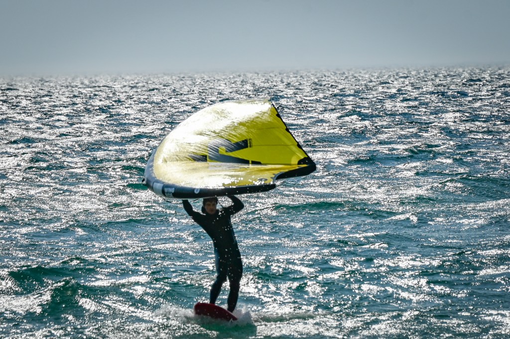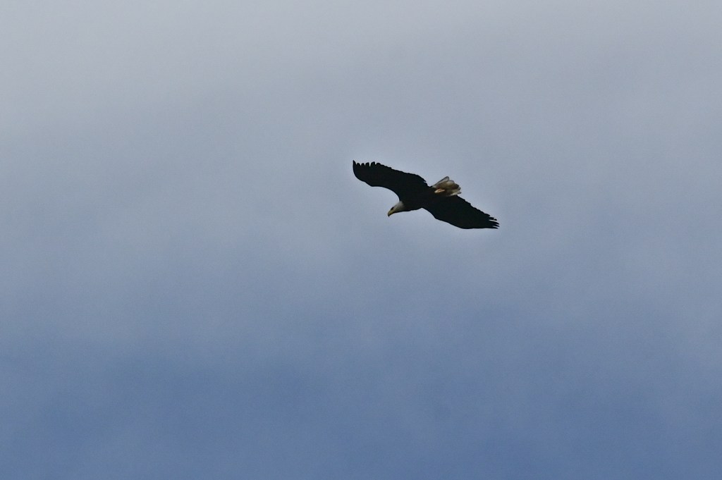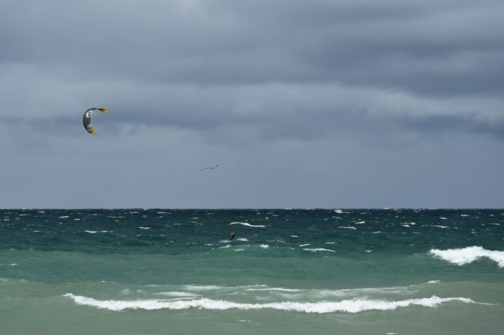 This guy was riding the waves and wind, while a flock of sandhill cranes in the distance fly against the wind.