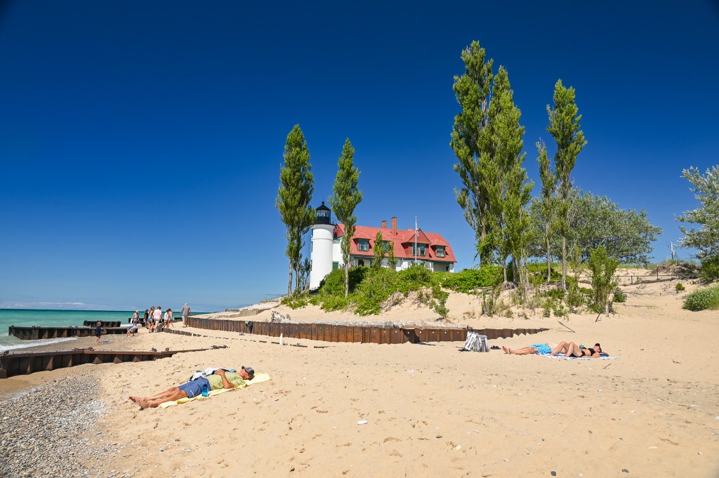 Lake Michigan’s green, almost tropically colored water froths around the brilliant red building.
