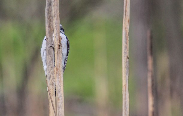 I turned and headed back toward the parking lot. On the way I ran into another cute little woodpecker. He didn’t really want his picture taken so he moved around behind the old cattail reed he was working on.