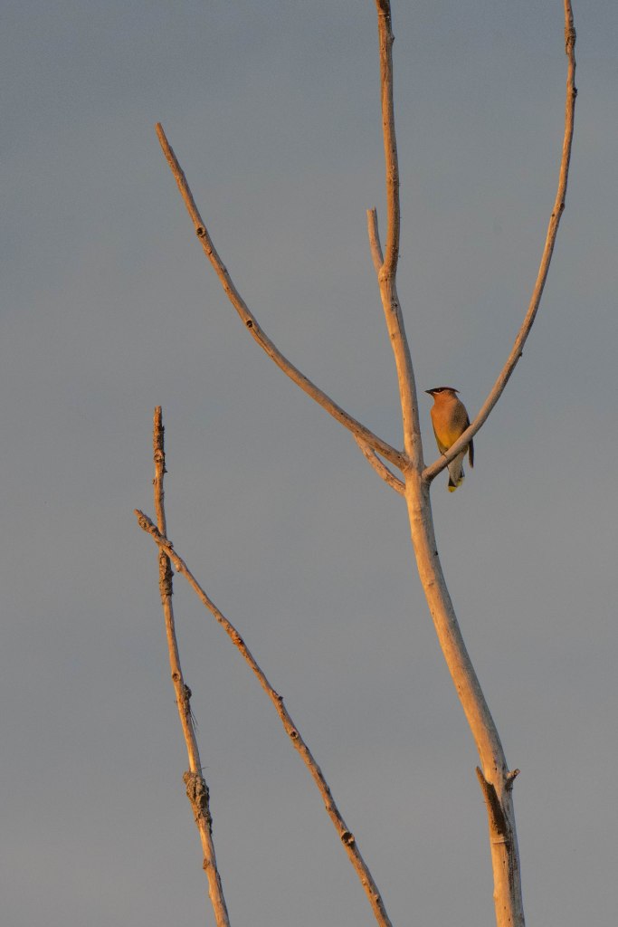 We decided to watch the sunset from there and then decide what to do. While we were watching the sun a small flock of cedar waxwings showed up, sitting in the dead tree near us and then flying out to catch bugs. The light was low and they moved so fast it was hard to get a good image.