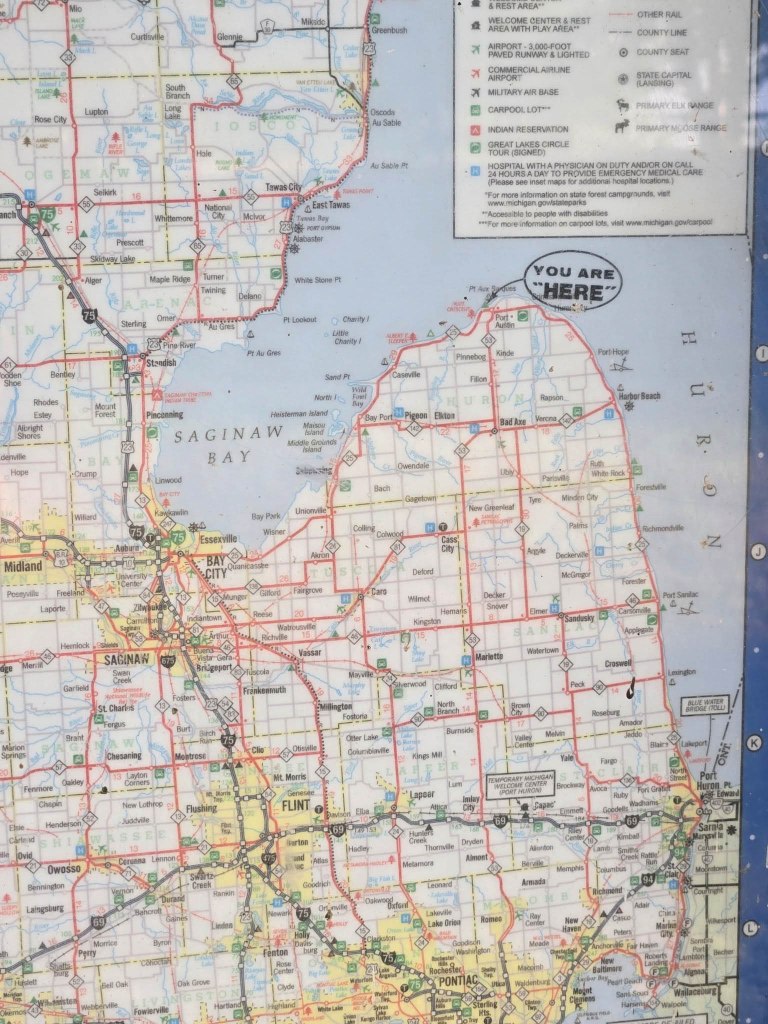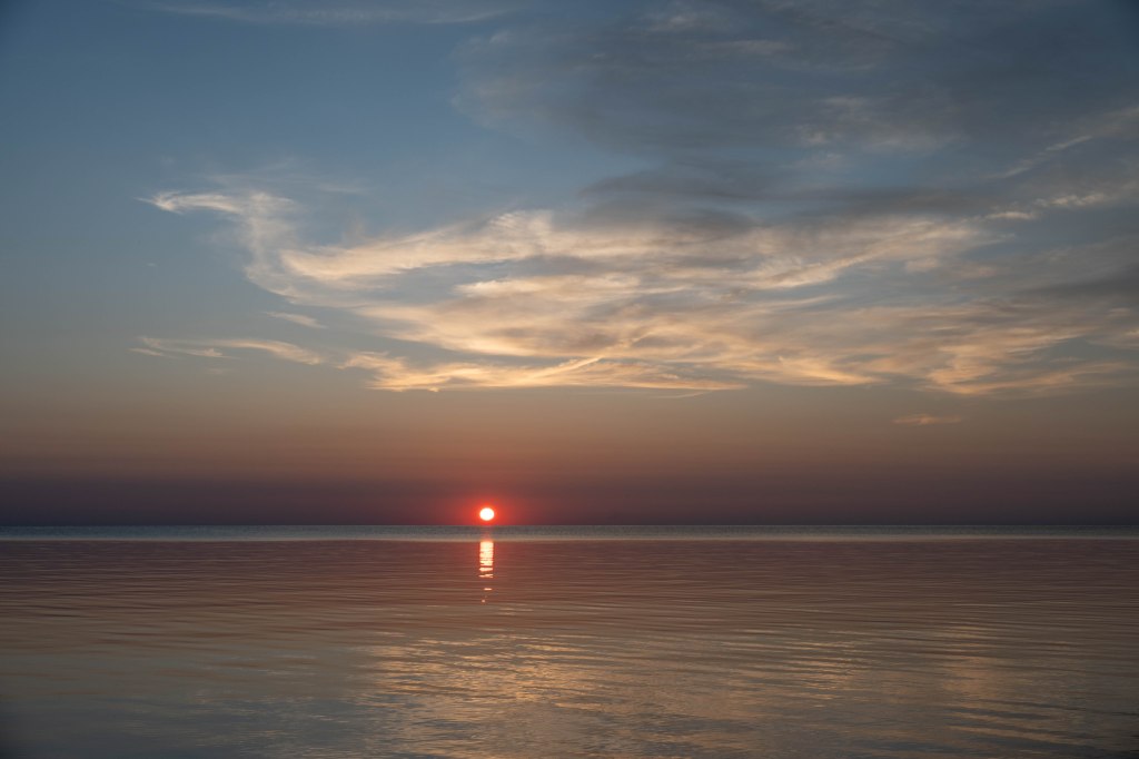 Across the way you can see retangles of golden light. I think, after studying a map, that must be Tawas, a large town on the other side of Saginaw Bay. I also wondered if there’s a bank of foggy mist out there.