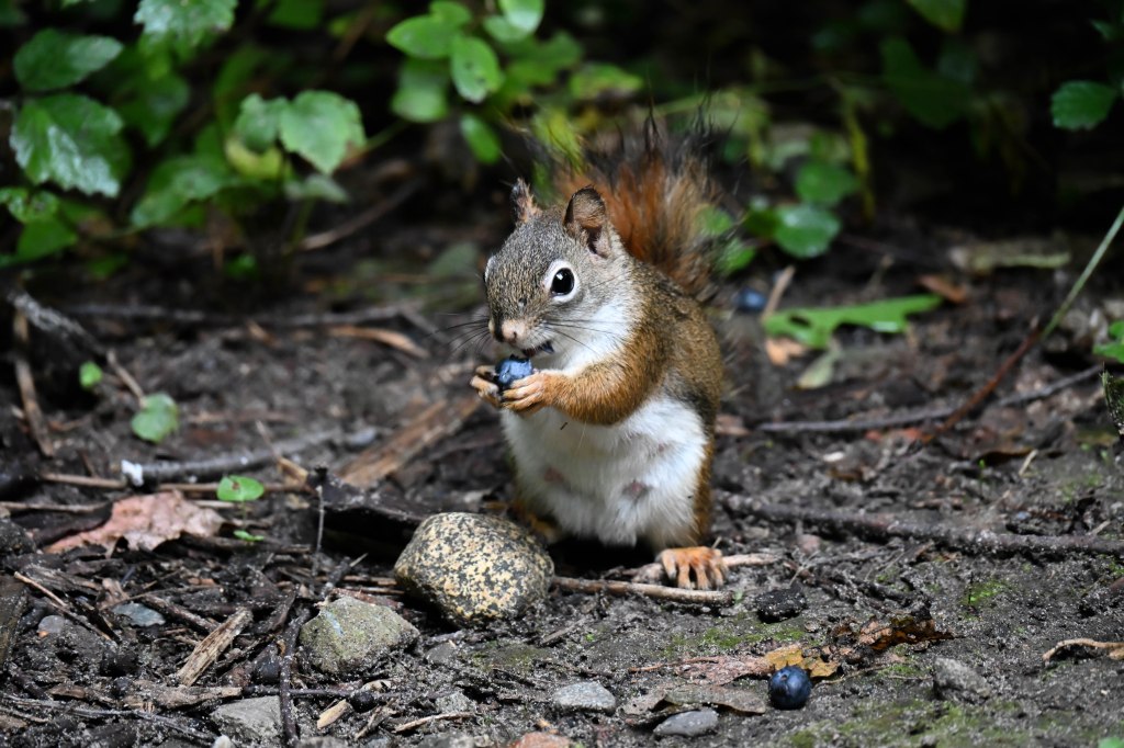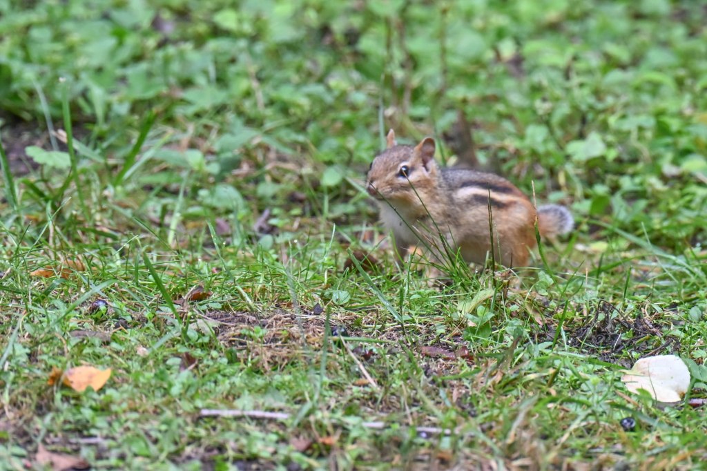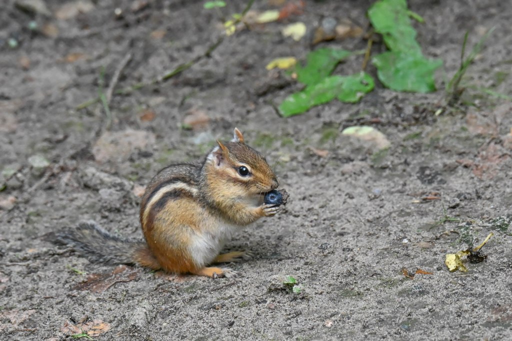 While I’m looking for her, tossing a few blueberries in the direction she ran, a opportunistic chipmunk showed up, very happy with the blueberry offering.