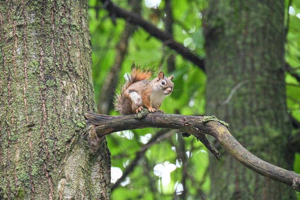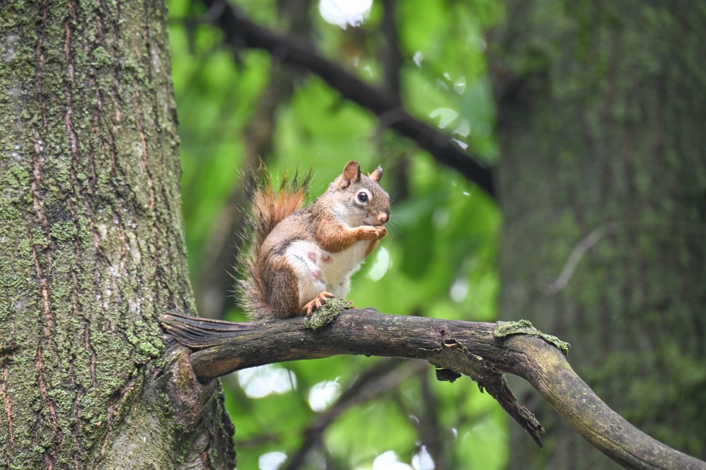 Meanwhile Ms. red squirrel, apparently a tired mom, was up in a tree at the edge of the campsite, happily chowing down on a nut.