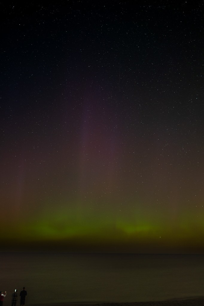 Well, not exactly saw, because to the naked eye it was just this moving mass of grey out over the black lake. But the camera saw it for what it was, stunning pink and green light.