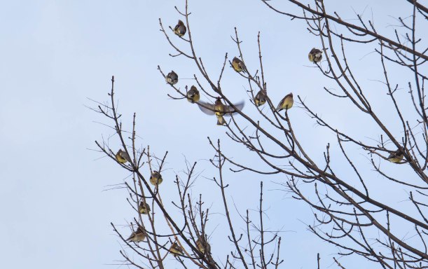 Yes you are correct! A huge flock of cedar wax wings! Those in the tree were resting after a big lunch. Lunch was a buffet on a tree full of red berries.