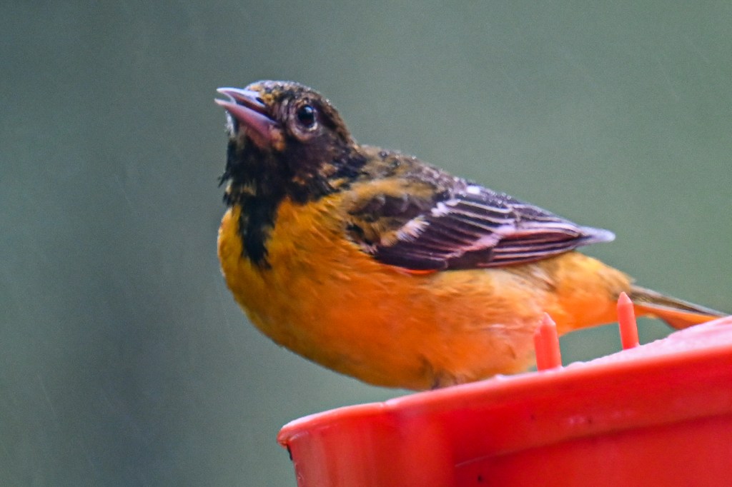 Edit: I was just outside to hang the oriole feeder up after cleaning it and refilling it with grape jelly. One of the two bathers was back, standing on the railing. He (or she) started flapping it’s wings at me, supposing that maybe I had something to feed it. So I think these two really are juveniles, and not adult females. So cute!