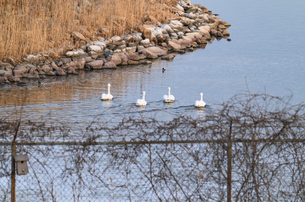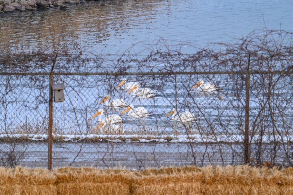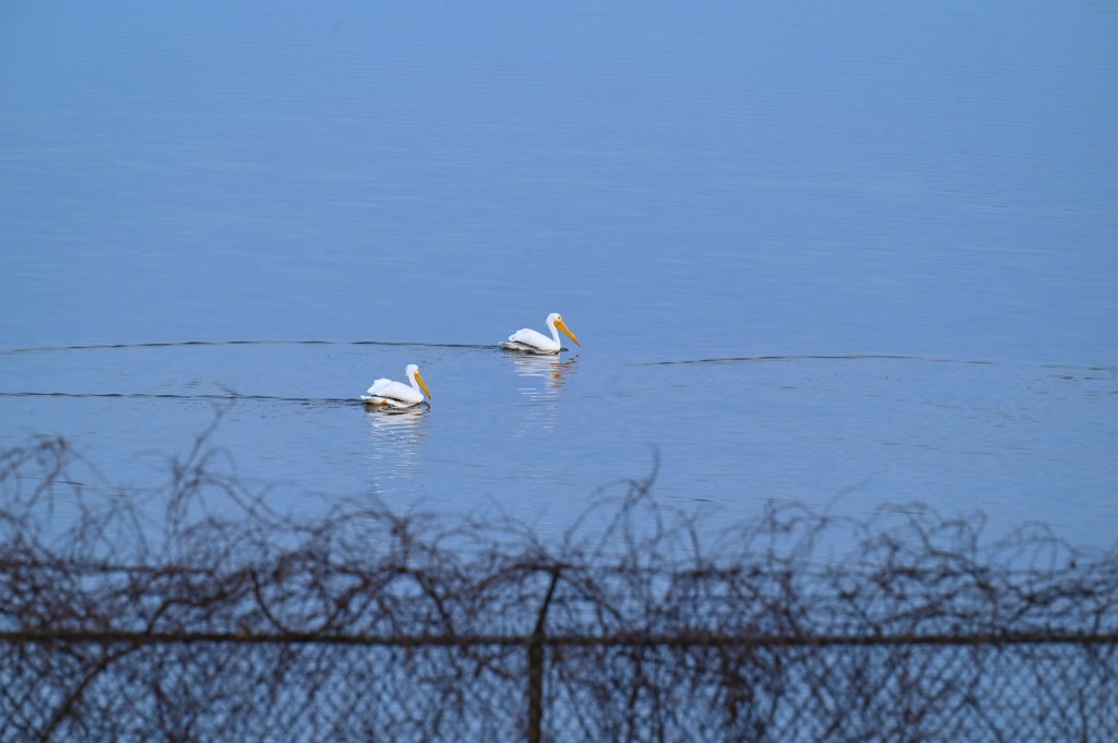 Next to me in the parking lot was another photographer, also with a long lens, also frustrated that the big white birds were swimming up and down along the edge of the pond, obscured by the fence.