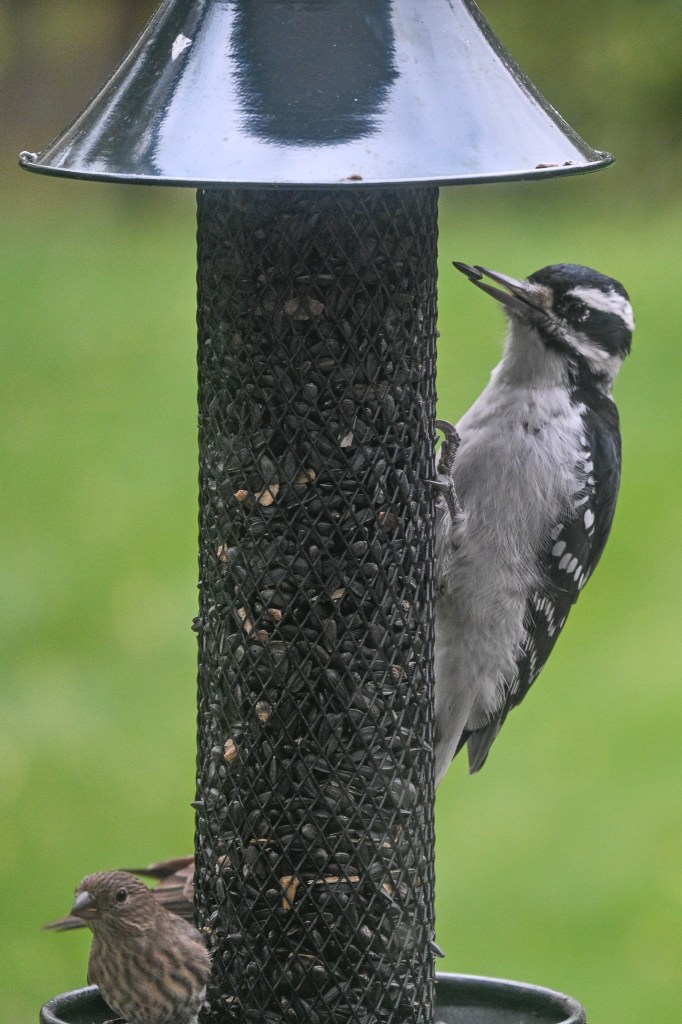 And Ms. Hairy Woodpecker arrived too, with her long beak. She at least shared the feeder with the little birds.