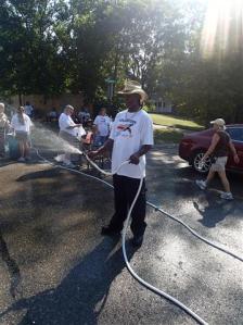 I turned west at the end of mile 5, coming out of the dark wet green of the woods into the open next to a golf course. I saw dark black clouds and heard distant thunder. I still had a mile to go. Well OK then. Starting up the last mile, the last long hill I could see rain beginning near the top. The breeze picked up. I picked up my speed too. At the top of the hill I turned into my subdivision, back onto paved roads. I slowed and watched the way the misty raindrops made yesterday’s puddles dance. Pretty. Maybe this was just God’s way of providing a giant mister, like they do at the end of a long race, to cool me down. Well OK then.