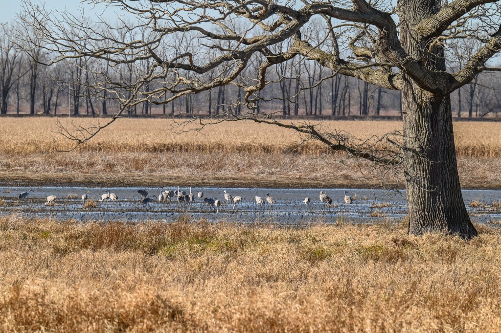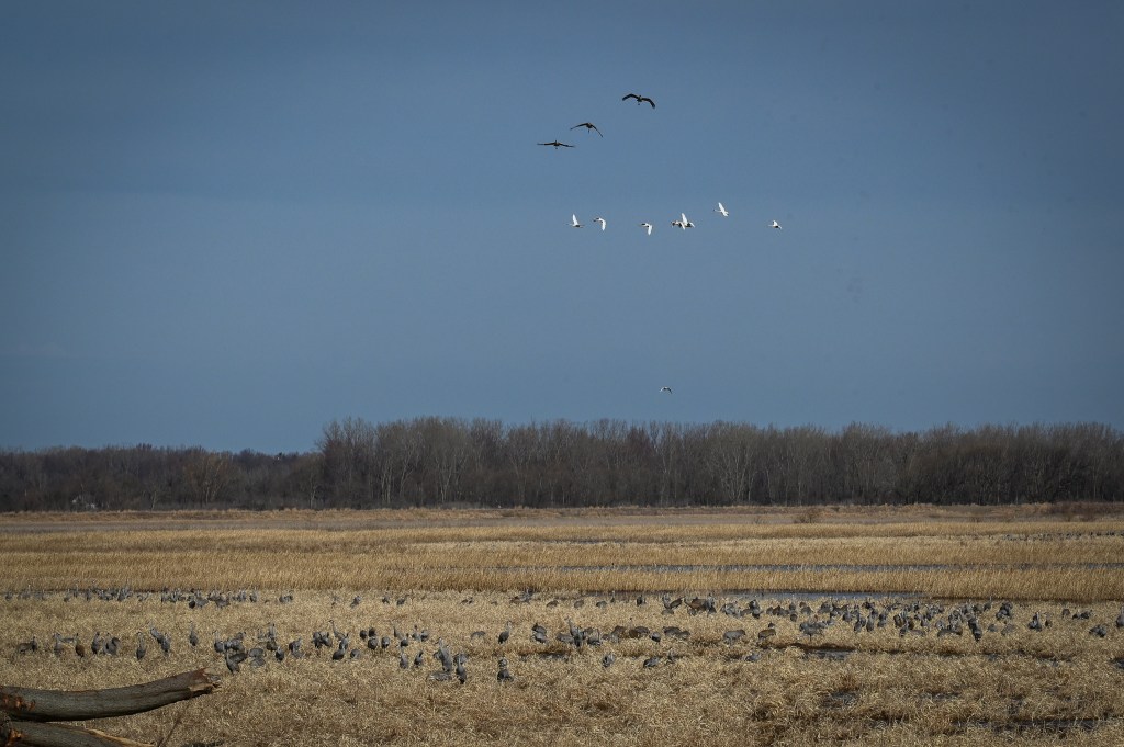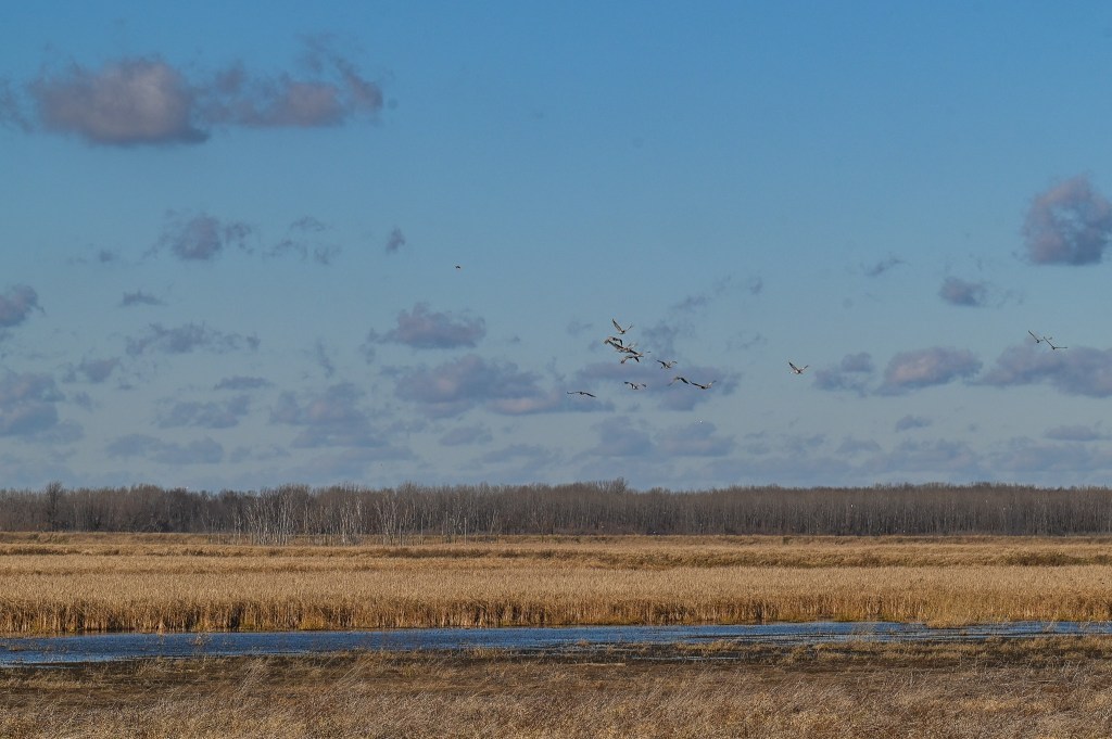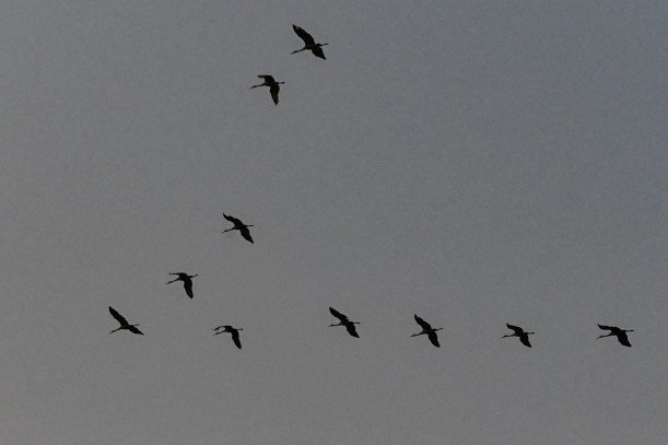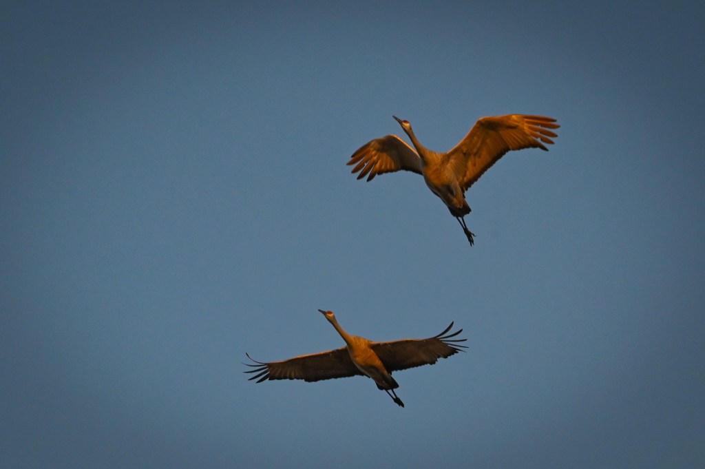 Huge flocks of sandhill cranes flew overhead in the early morning light.