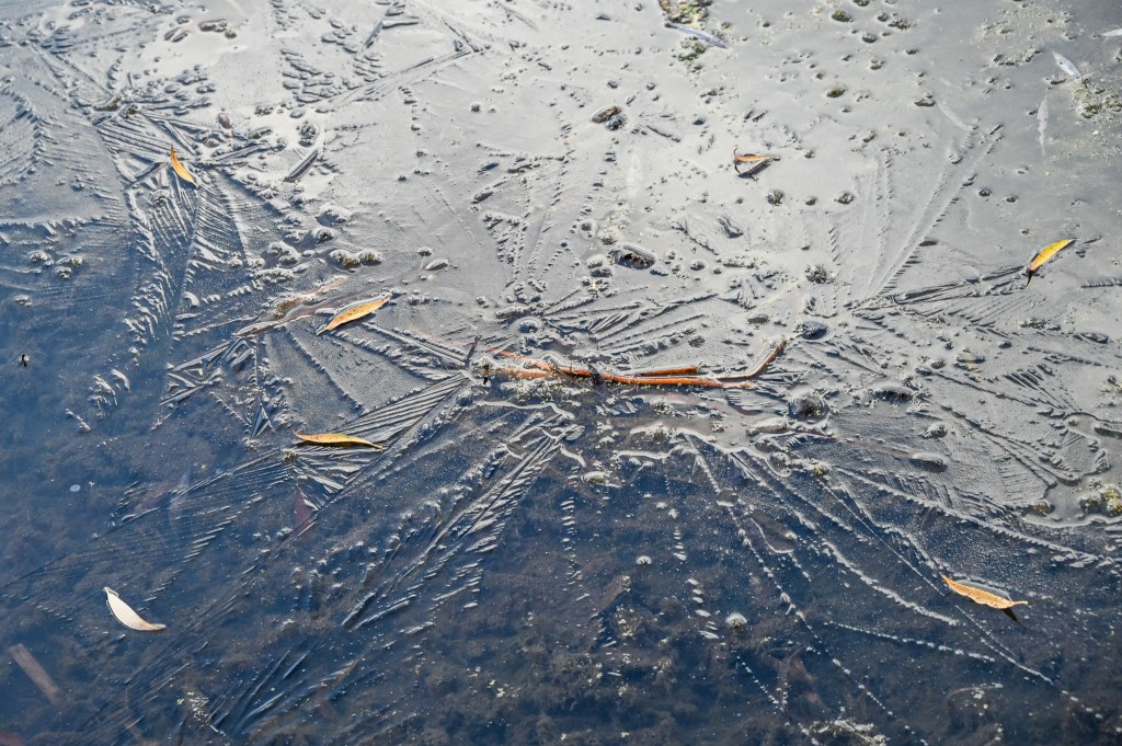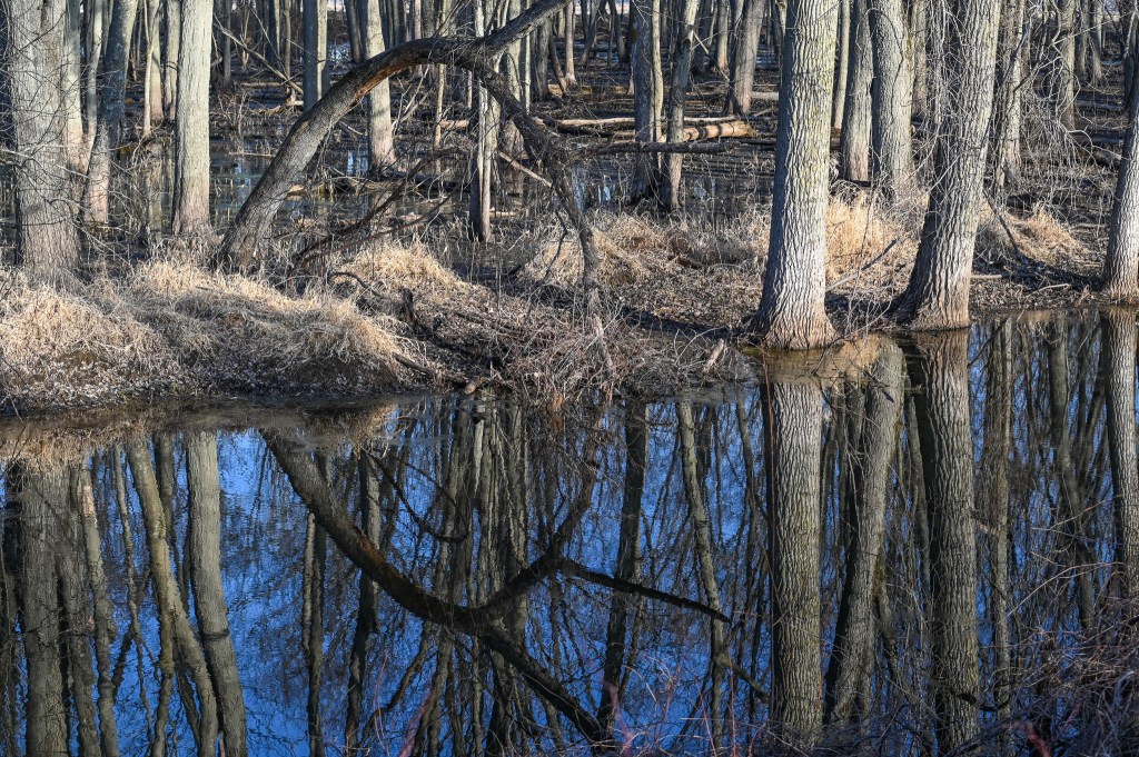 I crept along as well, because the trail was covered in crushed stone and my heavy, waterproof shoes were so noisy on the rock that every few steps ducks rose up from the water on either side of the dike I was walking on. The noise of their flight up out of the water is startling, even after I heard it a few dozen times.