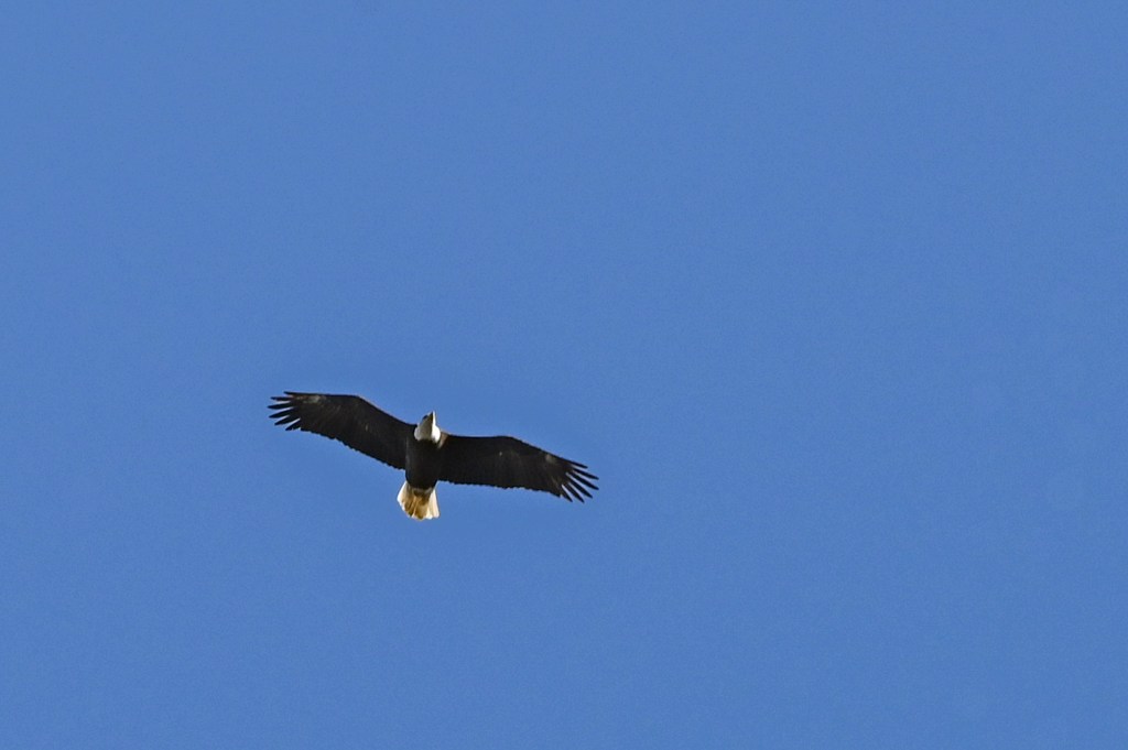 I turned to go, and over my left shoulder three large birds flew by. Three large white birds. Could it be? Yes! They were pelicans! My settings weren’t right for a moving bird, but I got some OK shots.