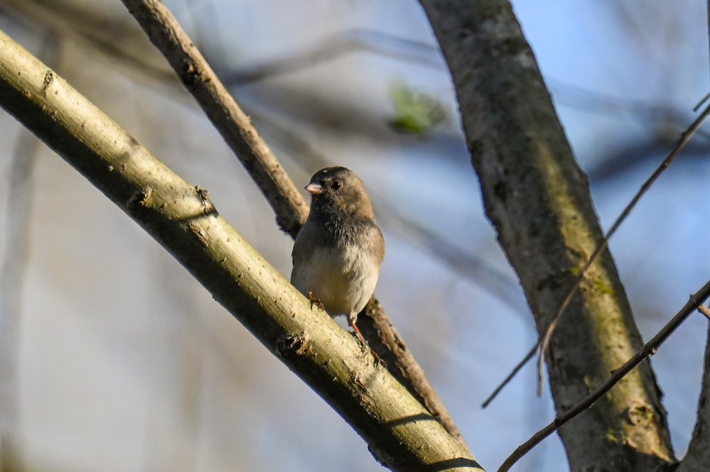 I noticed this little bird hopping along a big limb. Turns out, though I couldn’t tell at the time, that it’s a cute little junco. You can tell it from the phoebe by it’s pinkish bill. They should be migrating further north any time now.