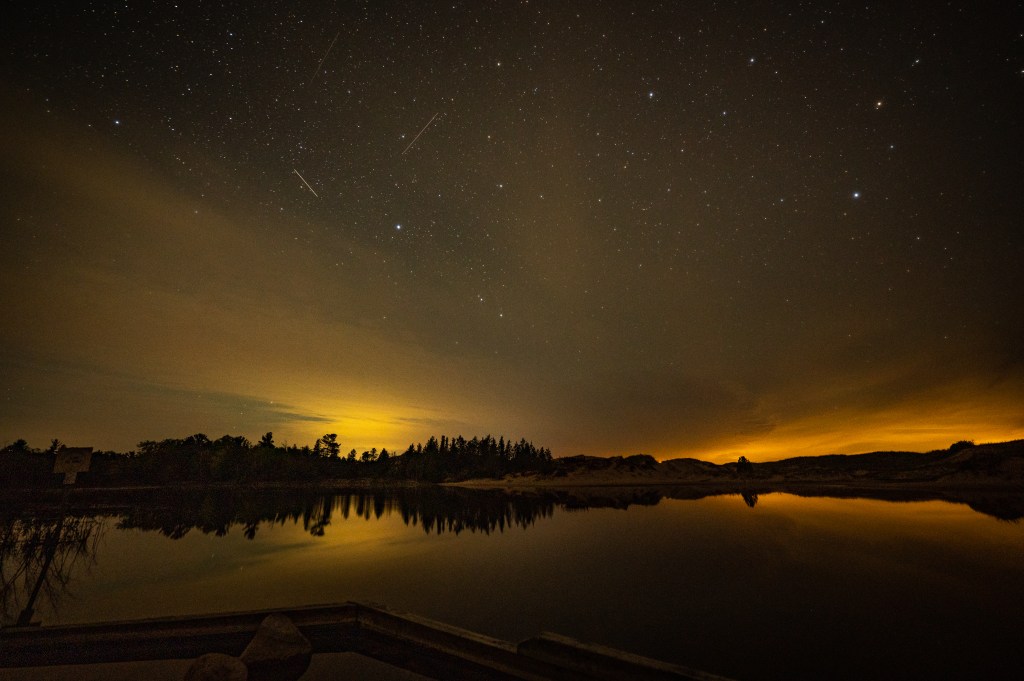 I wasn’t too worried, I had two more nights, and the forecast said we’d have beautiful, clear weather. So I slept my first night in my friend’s bunkhouse, a screened building with a comfortable bed from which I could hear the waves lapping at the shore and the birds singing in the morning. And during the night I could check the sky without even getting out of bed.