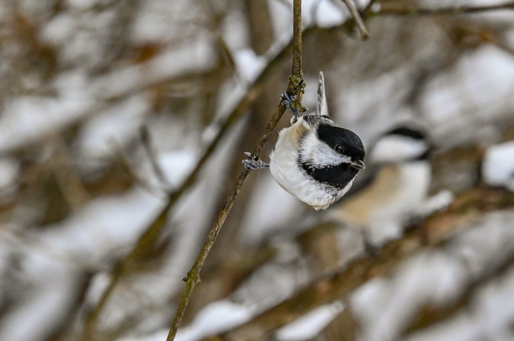 I know the birds watch me as I fill the feeders every morning. Every day, before I’m back in the house they’re usually fluttering around picking at their favorite spot. This morning I somehow missed the goldfinch feeder and as I was walking to the shower later I noticed a big bunch of them all huddled around the very bottom of their feeder.