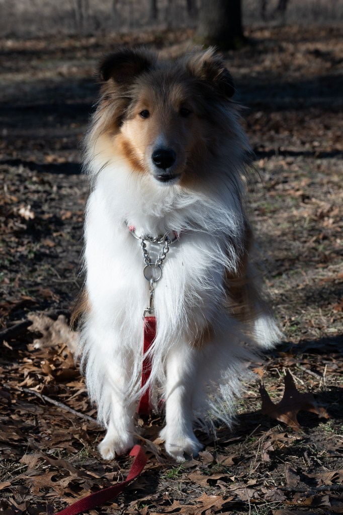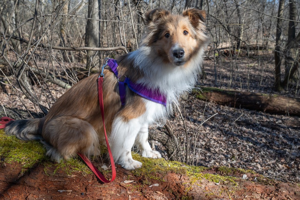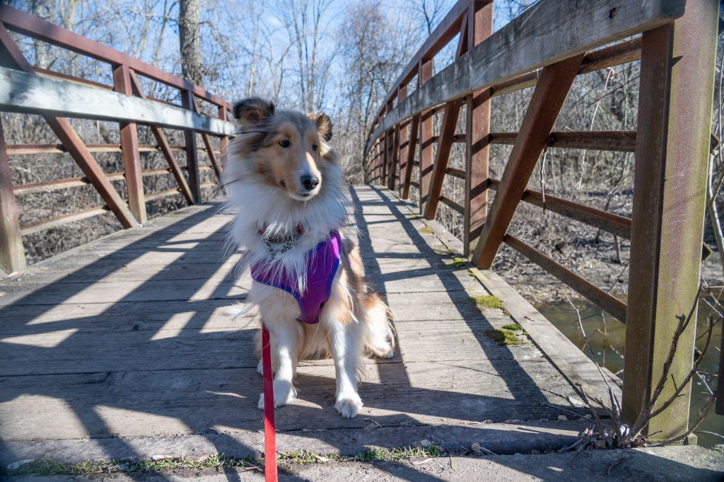 Somehow this park always gives mom uneasy feelings. She doesn’t know why. She says she never sees any other people there, but the day we were there we met a nice young couple out walking. It was getting late so we only did one small loop. I was getting tired of posing, but I stood on the bridge for her, and then on a log. But I wasn’t happy about it.