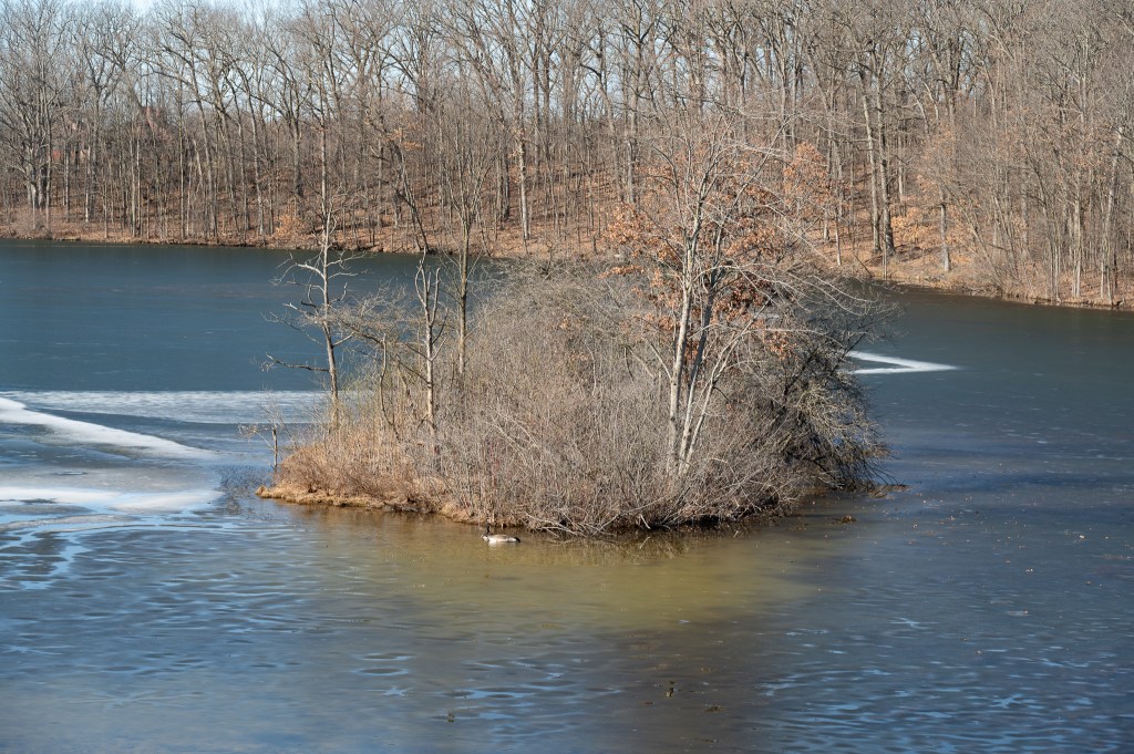 There was a little island out there with some geese swimming in the open water.