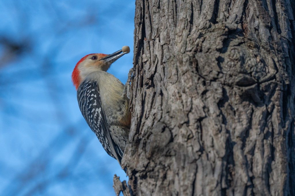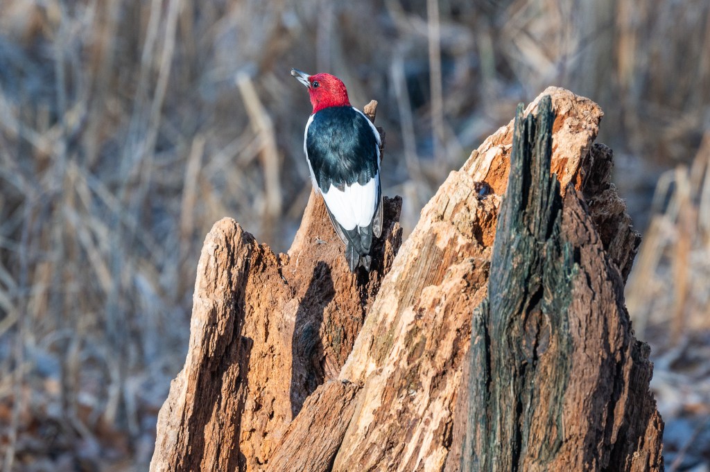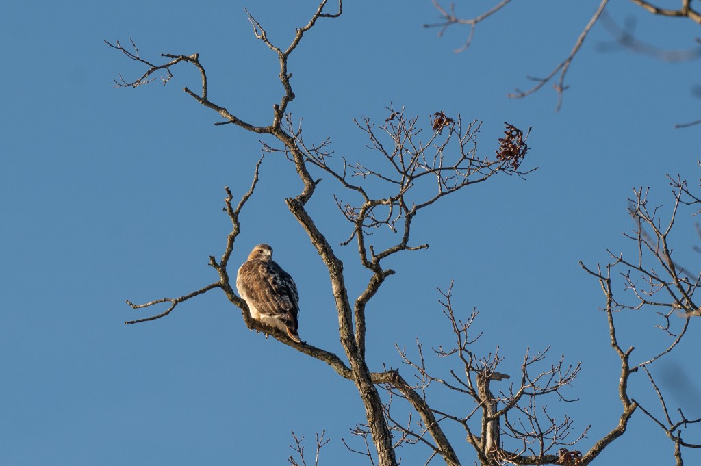 He flew up into a tree and then over to the outhouse building. Still not a photogenic location, but the sun was pretty on him there.
