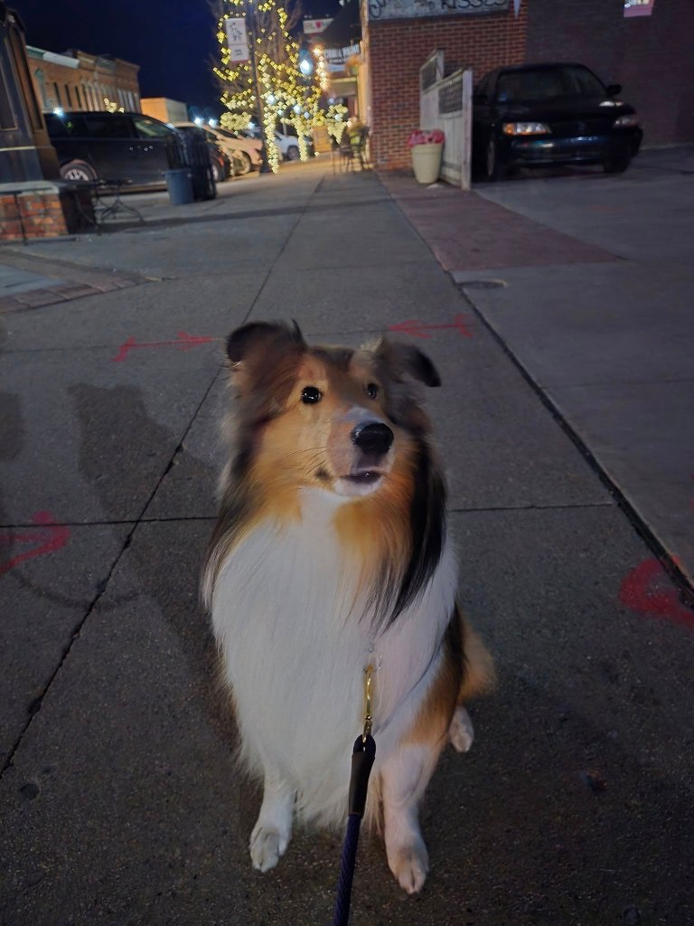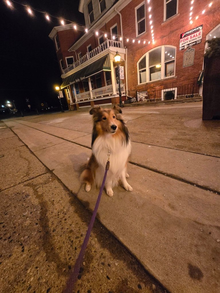 And then…last night, just when I was settling into my after supper nap which leads to my after supper sleep, mom woke me up and put me in the car and we went to a little historic town nearby where we met up with the same nice lady and another family with their dog, and we walked around town!
