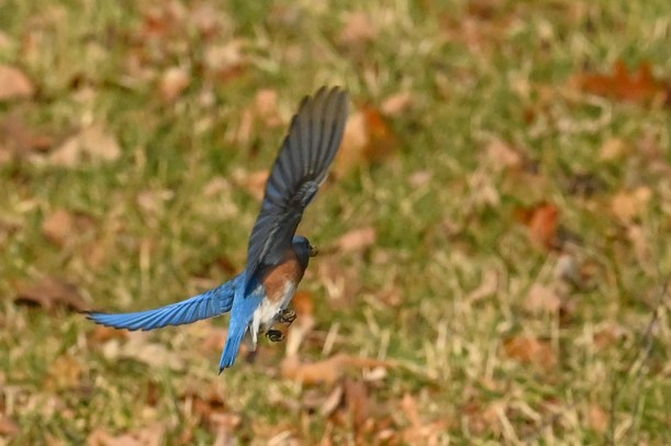 As I got closer I realize not all the sparkles were baubles. The trees were filled with bluebirds! And me with the short lens on the camera. I stopped right there on the side of the road and switched back to the long lens. Still, the birds were flitting back and forth, up and down from the tree to the ground. I’d catch a flash of brillant blue, but couldn’t get the bird in focus.