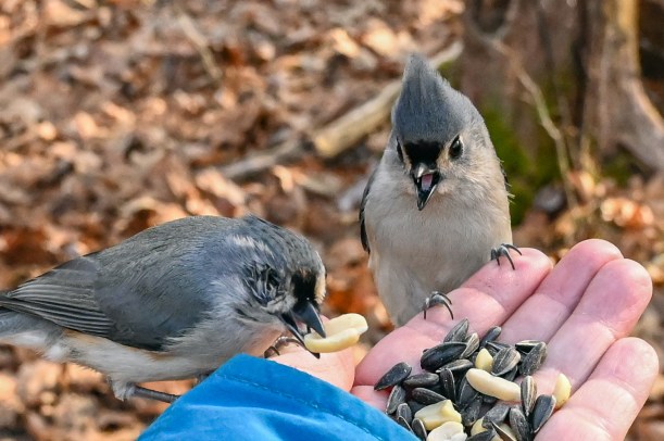 After the bluebird interlude I put the short lens back on the camera and headed back into the woods to finish my trek back to the car. As I got closer to the nature center the little birds began swarming my head. They were quite insistant. So of course I had to take the obligitory picture of a bird in the hand.