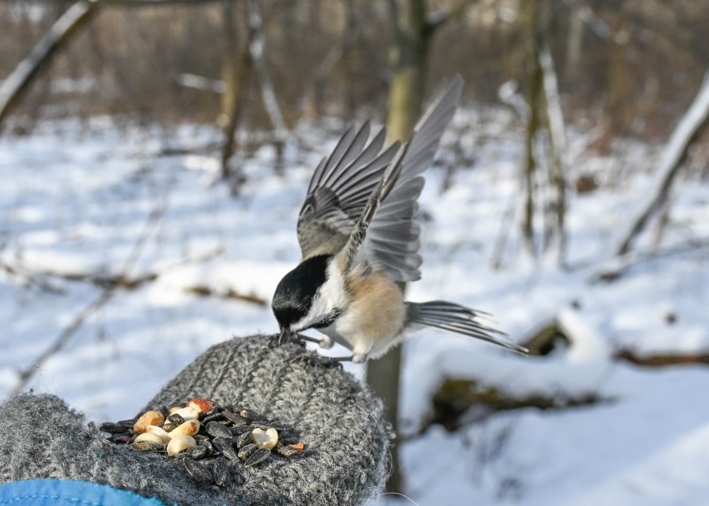 Mostly I was trying to get images of birds moving, they’re so beautiful in flight. But often I had the camera focused on my hand, waiting for the birds to land, and their wingspans turned out to be just outside the focus area. Lesson learned.