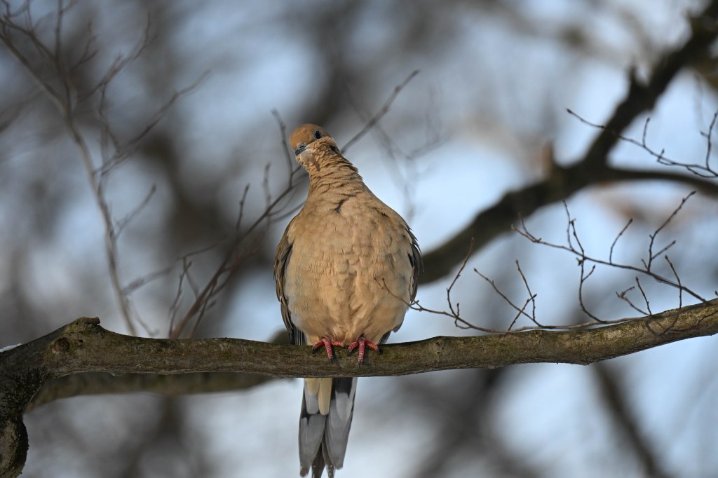 For the past couple of days there have been several female cardinals at the feeders, in the branches of the protective honeysuckle bush, and hiding among the last leaves of the beech tree.