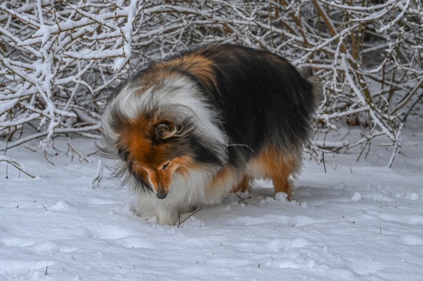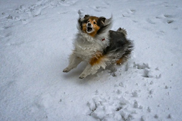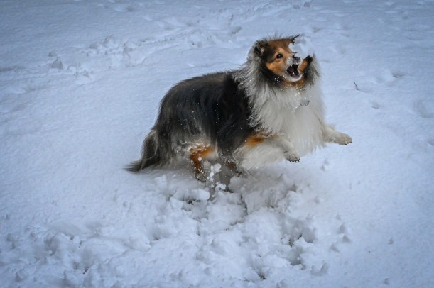 Mama felt bad about almost laughing (and also about not bringing treats), so she asked me if I wanted to chase a snowball or three. Really mama!?!?!
